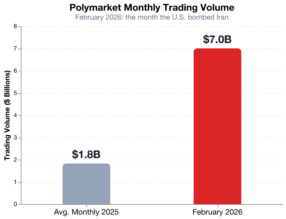 Polymarket processed $22 billion in trading volume in 2025. Hit $7 billion in a single month. February 2026. The month the United States bombed Iran.¹⁶
