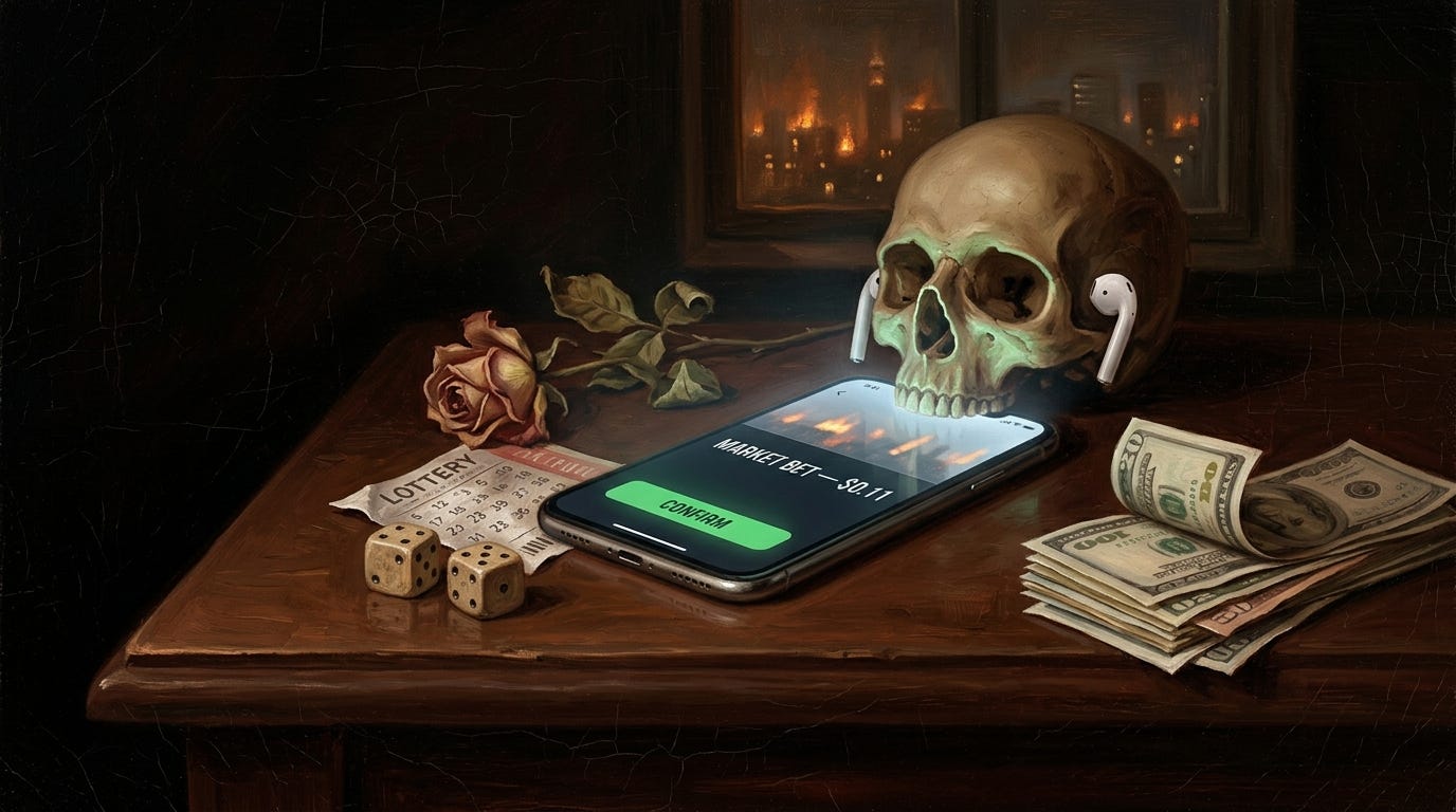 Because the prediction markets don't just let you bet on interest rates. They let you bet on wars. On assassinations. On famine. On whether a nuclear weapon will be detonated this calendar year. On how many people will be deported. On whether a journalist will be killed.
