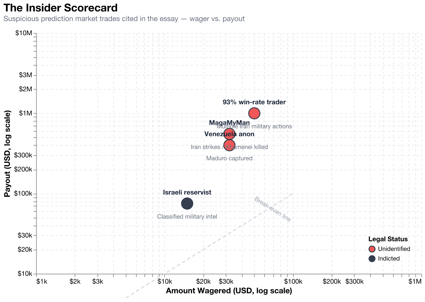 A user called MagaMyMan placed $32,000 on the United States bombing Iran on a specific date. Odds: seventeen percent. Hours later, strikes began that killed Iran's supreme leader. Payout: $553,000.²² An anonymous user created a brand-new Polymarket account in December, bet only on Venezuela, staked $32,000, and netted over $400,000 in twenty-four hours when Maduro was captured.²³²⁴ An Israeli military reservist has been indicted for using classified material to trade on Polymarket -- the first prosecution worldwide for weaponizing military intelligence on a prediction market.