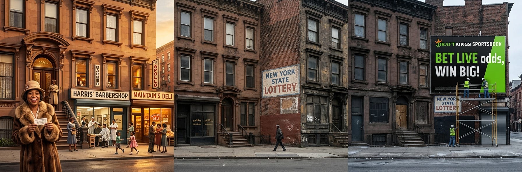 New York processed $26.3 billion dollars in legal sports betting in 2025⁴ -- same state that spent the twentieth century arresting Black men and women for running numbers in Harlem. The communities whose gambling was criminalized for generations are now the most enthusiastic participants in the legalized version -- Black Americans bet at the highest rate of any demographic⁵ -- except now the profits don't stay in the neighborhood. They flow to corporate headquarters and hedge fund dividends, to Super Bowl ads and lobbying firms. Queenie's game, stripped of everything Queenie built.