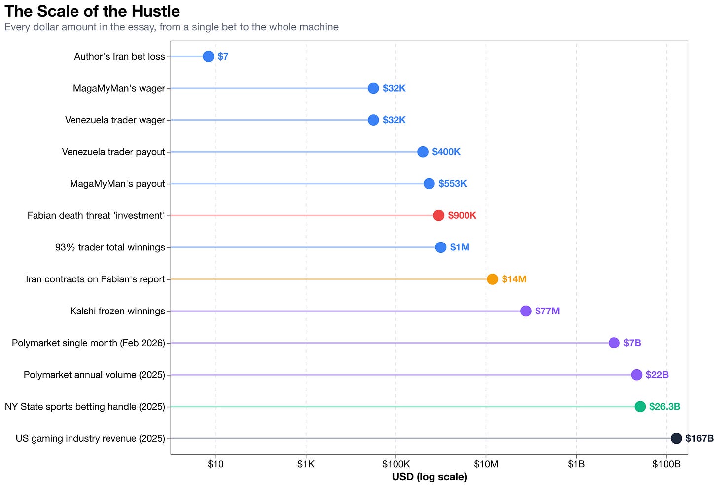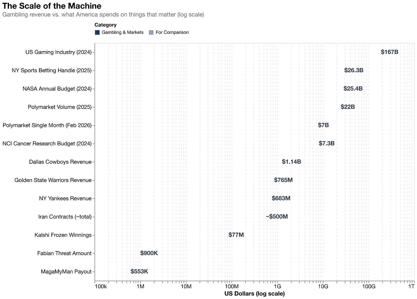 Letting half a billion dollars slosh through contracts on whether Iran gets bombed doesn't just aggregate predictions about the bombing. It creates a financial constituency that profits from the bombing happening. It makes the bombing a product. It creates demand.¹⁸