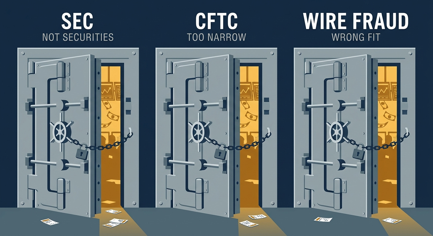 The legal architecture for stopping this does not exist. Prediction contracts are commodities, not securities -- the SEC can't touch them. The CFTC's anti-fraud rule is narrower than its securities counterpart. Wire fraud requires the information to have commercial value to the defrauded party. Three doors, all locked, and the locks were installed by people who never imagined that war would become a retail product.²⁶²⁷