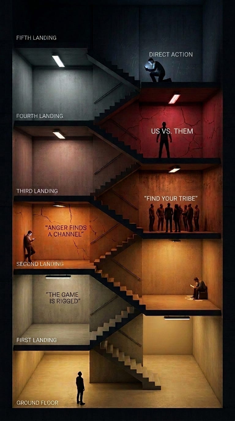 The five planes of this arc -- the hustle nationalized, the sports corrupted, the markets commodified, the insiders arrived, the journalist threatened -- map onto Moghaddam's staircase like a key into a lock. Same engine at every landing: a person promised fairness, discovering betrayal, escalating because each landing reveals a deeper betrayal than the one before.
