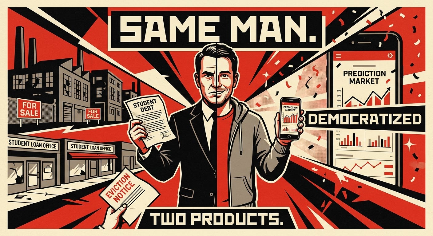 He said this while pitching his platform as the antidote. The level playing field. The place where the Kansas farmer can beat Goldman Sachs because everyone has the same information and the same odds and the market rewards wisdom over connections.