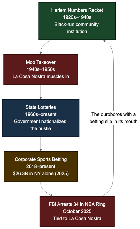 October 2025: the FBI arrested thirty-four people in a rigged sports betting ring tied to the NBA. A Hall of Famer. A head coach. A current player on the Miami Heat. And the FBI linked the operation to La Cosa Nostra -- the same organized crime families that took over the Harlem numbers racket from Black operators eighty years ago. The mob never left gambling. Gambling came back to the mob. A goddamn ouroboros with a betting slip in its mouth.⁹¹⁰