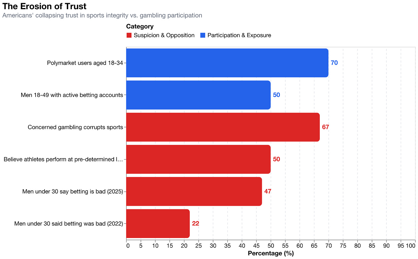 Forty-seven percent of men under thirty now say legal sports betting is bad for society -- up from twenty-two percent three years ago. The opinion shift is the most dramatic of any demographic. They can feel the teeth. They know.³⁸